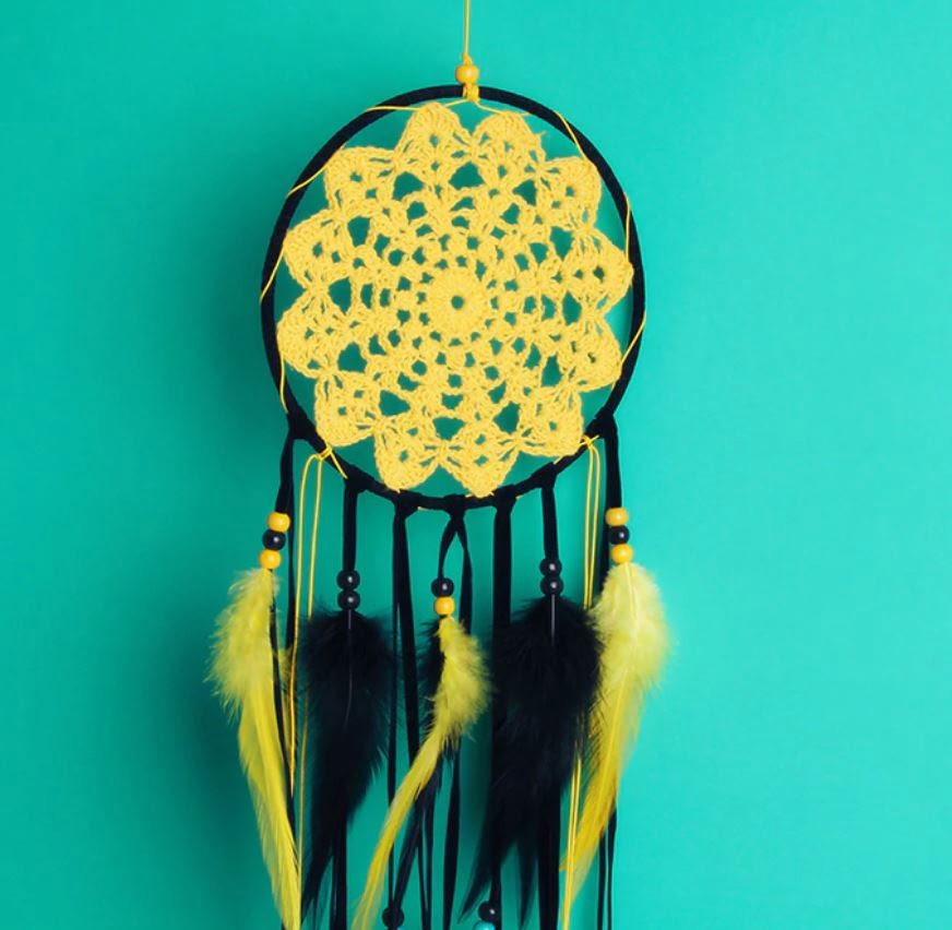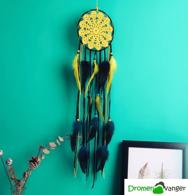 Mooie dromenvanger met een handgeknoopt web. Uitgevoerd in een mooie en unieke kleurstelling vormt deze dreamcatcher een geheel eigenzinnige uitstraling de huiskamer binnen.