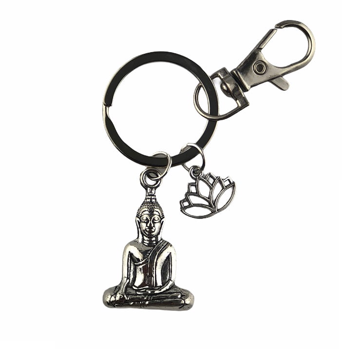Sleutelhanger met Zittende Boeddha en geopende Lotusbloem. Deze sleutelhanger is voorzien van een solide sleutelring en gaat dus lang mee.